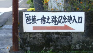 | 案内板の矢印に従って細い道を入って行くと、山裾にこの「芭蕉一泊之碑」がありました。 この地は旧・尾形医院の跡地だそうです。 |