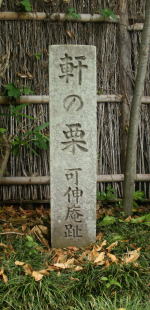 | 等躬宅に宿泊、会を催し、さらにこの可伸庵でも会を催して詠まれたのが 「世の人の 見付けぬ花や 軒の栗」 であるとか。 通りに面して「可伸庵跡」、石段上の左に「軒の栗」の碑がある。その奥には「奥の細道」からの俳文碑もある。 |