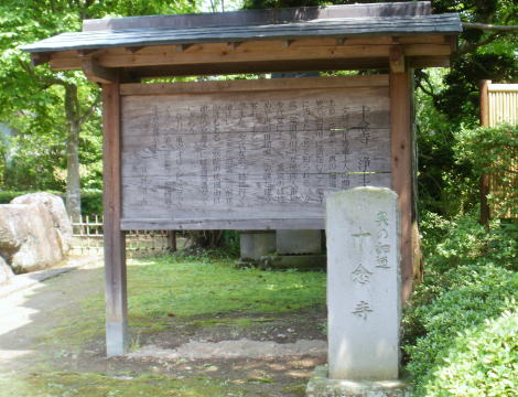 | 十念寺の境内にある説明板には「奥の細道の旅で須賀川に滞在し、この寺に詣でた」ことが記してある。 句碑はこの奥の方に建っている。 |