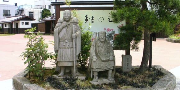 | 須賀川の街中にも「芭蕉と曽良」像があった。 ここは須賀川市本町の「結の辻」市民交流広場だそうです。 |