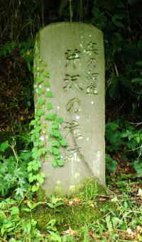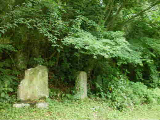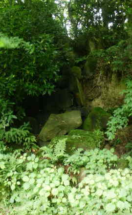 | 可伸庵跡から2.5㌔、そこから標識にしたがって、畦道のようなところを100㍍弱はいってい行くと芹沢の滝跡に辿りつく。 この滝跡を訪れたときは梅雨の最中、前日が雨だったこともあって、足元が泥濘なんとか到着。 滝跡と云うように水が流れ落ちてはいないが、木々の陰の岩々に当時の面影を見ることができる。 |
