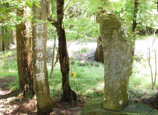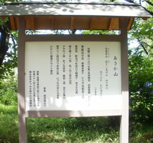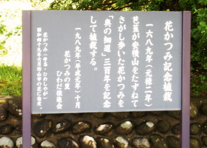 | あさか山 等躬が宅を出て五里斗、檜皮の宿を離れて、あさか山有。路より近し。此あたり沼多し。 かつみ刈比もやや近うなれば、いずれの草を花かつみと云ぞと、人々に尋侍れども、更知人なし。沼を尋、人にとひ、かつみかつみと尋ありきて、日は山の端にかかりぬ。 (奥の細道の一節より) |