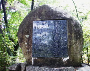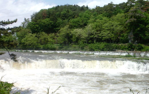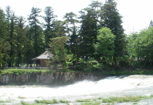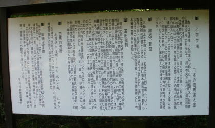 | 乙字の滝へは須賀川から石川街道を玉川村へ向かい、乙字大橋を渡った玉川村側にある。 「乙字ケ滝」石柱のところから川沿いに入れば、この園地の滝見不動堂、芭蕉の句碑、等々の歴史を記した案内板がある。 My自転車で向かうときには快適な走行であるが、戻りはだらだらの登りで結構なきつさがある。 |