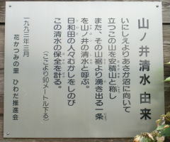 | 「山ノ井清水」の 案内板を見つけたが残念ながら尋ねる人もおらず、場所の特定に至らなかった。 |