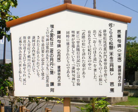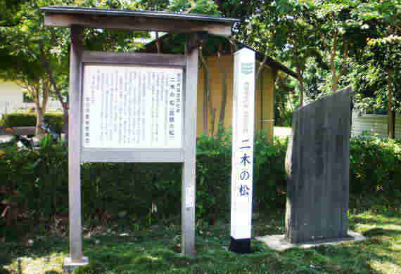 | 「二木の松」の傍には説明板と二木の松の碑が建っている。 その説明板には 「岩沼入口ノ左ノ方ニ竹駒明神ト云有。 ソノ別当ノ寺ノ後ニ武隈ノ松有。竹がきヲシテ有。ソノ辺、 侍やしき也。古市源七殿住所也。」 と、曽良日記の一節も記されている。 |