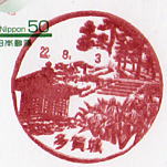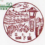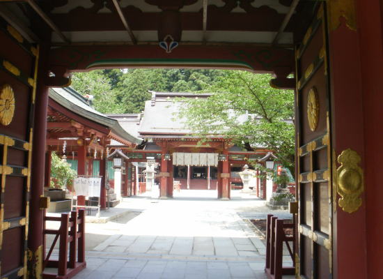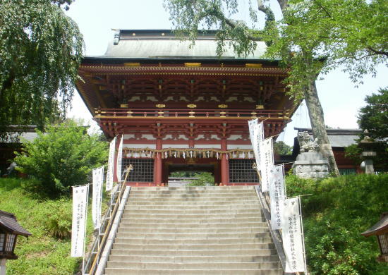 | 風景印に描かている楼門の壮大さが参道入口から見上げればよく判る。 石段の数202段。真夏の石段登りは結構疲れる。 |