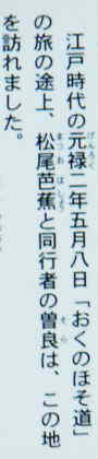 | 芭蕉の奥の細道 「塩竈の明神」の項に 「・・・神前に古き宝塔あり。・・・五百年来の俤、今目の前に浮かびてそぞろ珍し。かれは勇義忠孝の志なり。・・・」 と記している。 |