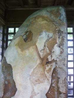 | 多賀城碑を格子に接近させて写したら碑の表面は写せましたが、全体が判らなくなってしまいました、 説明板によると「砂岩を加工し文字を刻んだ」とあり、「高さ2㍍、巾1㍍厚さ70㎝」と記してありました。結構な大きさです。 |