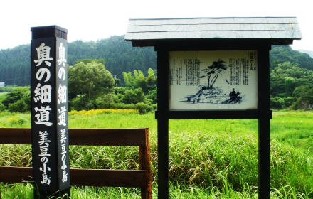 | 小黒ヶ崎から進むこと約800㍍。道路のきわに、「美豆の小島」の案内板があります。 そこから細い道を入っていくと説明板があり、、曽良日記の一節 川中ニ岩島ニ松三本、其外小木生テ有。水ノ小島也。今ハ川原、向付タル也。 の解説と新古今和歌集の唄が記されています。 この説明板の絵と同様の小島が観ることができました。 |
