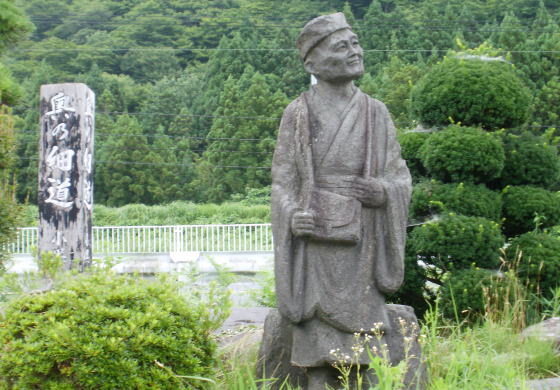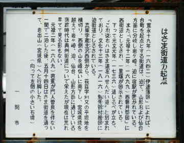 | 芭蕉が岩出山への行脚て通ったはざま街道の分岐点は「一関台町」郵便局から100㍍弱南下したところに道標と案内板がありました。 |