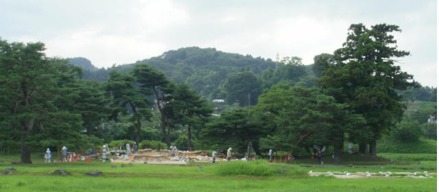 | 炎天下のなか遺跡の発掘調査が行われていました。 見学していた時は天候は良かったのですが 、暫くして雨模様になり、調査員の方々はシートなどでの保護作業で大変だったのでは・・・・・・と思ってしまいました。 (H22.08.04 15:40平泉駅で雨宿り) |