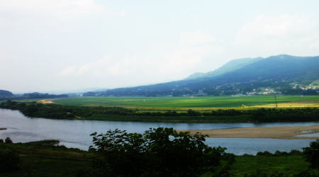 | 高舘へあがり望んだ景色です。展望説明板によると「衣川古戦場」はもつと左の方に記してあり、芭蕉が望んだ景色とは一寸異なるのかも。 |