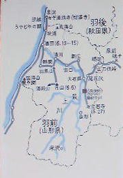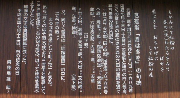 | この句碑は羽州街道六田宿・現在の東根市六田「焼麩元祖・斎藤本店」敷地内に建立されていて、句碑の近くに「斎藤重雄 識ス」との説明板がありました。 斎藤家の方に敷地内立ち入りのご挨拶のときに、説明板とおなじ文の載っている栞を頂きいろいろとお話を伺っていたら、単に曾良日記を読んでいては判らない貴重な箇所に気づきました。 「内蔵ニ逢。立寄ば持賞ス」とは何を食べたのだろう・・・・・」と興味津々。 やはり麩茶料理だったのかもしれない。 また、栞のなかに東根市発行「東根市史別巻上」からの抜粋として羽州街道の山形県内17の宿駅名が載っている。街道好きな私にとってはこれまた貴重な考資料である。 |