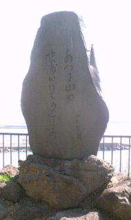 | 芭蕉の句碑、日本海に沈む夕日、庄内砂丘、鳥海山の遠景。 |