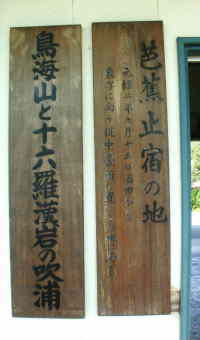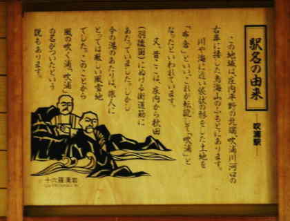 | JR吹浦駅に着いたらそこは無人駅だったが、駅には「駅名の由来」とかホームには 「芭蕉止宿の地 元禄二年六月十五日酒田から 象潟に向かう道中豪雨に遭いこの地にとまる」 との看板があった。 この地の宿は曾良日記にも記して無いので不明のようである。 又、この看板の隣には「鳥海山と十六羅漢岩の吹浦」の看板もあった。 |