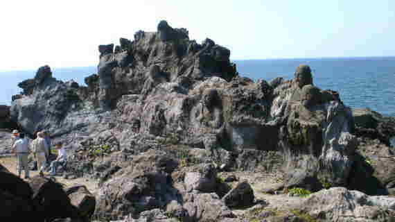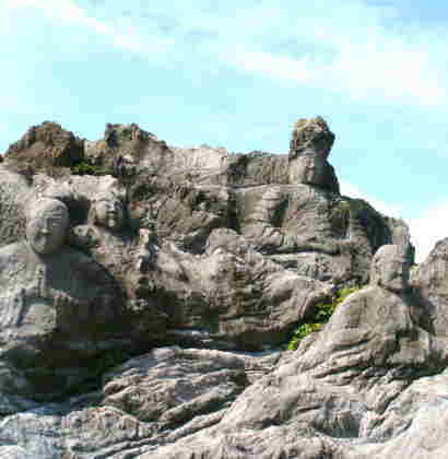 | 句碑のある場所からもう少し羽州浜街道を進むと、この十六羅漢岩の全景を見ることのできる展望台に行ける。 ここには四阿があり一休みすることができるし、傍に説明板などもある。しかし、この場所からでは羅漢さんの大きさと迫力を実感できないので、是非とも浜のほうへ下りていくことをお勧めしたい。 |