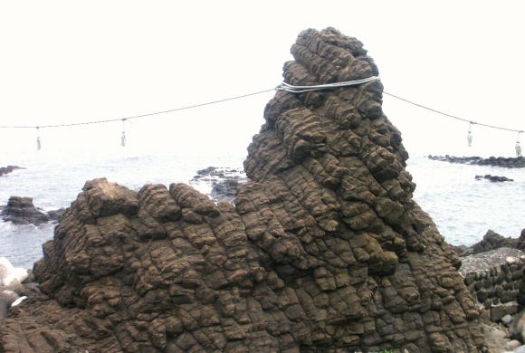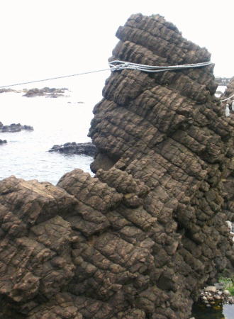 山形県の観光情報によると「俵を積んだような奇岩で玄武岩脈の一塊でよく発達した層状節理とこれに直角に発達した五角形または六角形の柱状節理とが交互に交差してあたかも塩俵を積み重ねたような奇観を呈するのでこの名がある」とあり、まさに奇岩でにあった。 |