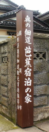 | 芭蕉の宿泊した「鈴木邸」には今も住んでおられるとのことで、道路から標柱と家屋のいち部を写した。 標柱の側面には 「山形県奥の細道観光資源保存会」 と記してあり大切にされていることを知ることができる。 ちなみにJRあつみ温泉駅がら600㍍位である。 又、ここから塩俵岩まで約2.4㌔㍍ほどでいける。(路線バスもあり、時間が合えば5~6分でいけるとの事) |
