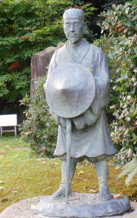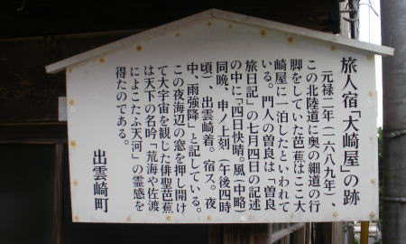 | この芭蕉園は出雲崎の北国街道沿いに小ぢんまりとある。奥の方には芭蕉像や「銀河の序」よりの文を刻した俳文碑などがある。 また、この園内には「北国街道往来人物史」なる掲示板があり、交通の要衝であり主だった人物が西暦668年から載っている。 歴史好きな人には堪らない一品である。 |