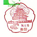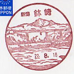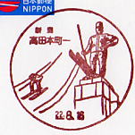 | 高田駅前局で風景印を入手したら絵柄に「???」 とりあえず句碑をめざして進み、対米館に一番近いと思われる本町一局での押印ではスキーのジャンプ台であった。 以前同僚から頂いていた「高田」の絵柄とギャップが在りすぎなので局の方に伺ったら「オーストリアのレルヒ少佐が 日本に初めて本格的にスキーを伝えた地」なのだそうだ。 |