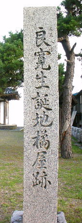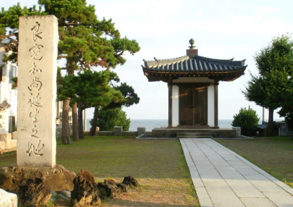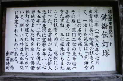 | 出雲崎は風景印にみられるように「良寛」の町である。 「良寛堂」や「良寛記念館」があり、「良寛生誕の地・橘屋跡」ととか少しばかり離れたところには「良寛剃髪の寺」など枚挙のいとまもない。 そんななかで「良寛も後年芭蕉を賞えていた」とパンフレットに書かれていてたのをみると芭蕉の凄さをさらに感じてしまった。 |