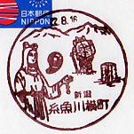 | 山の上に荷を運ぶボッカと道路元標と奴奈川姫像と勾玉。 |