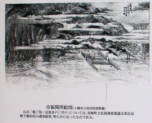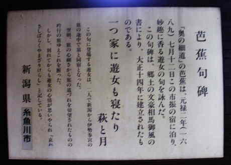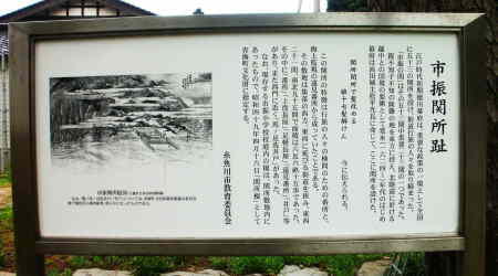 | 市振小学校・中学校の所に関所があったようで、「市振関所跡」の碑と説明板がありました。 この関所は徳川幕府の重要23関の一つとして陸路の番所と海上監視の遠見番所の役目もあったと記されていました。 |